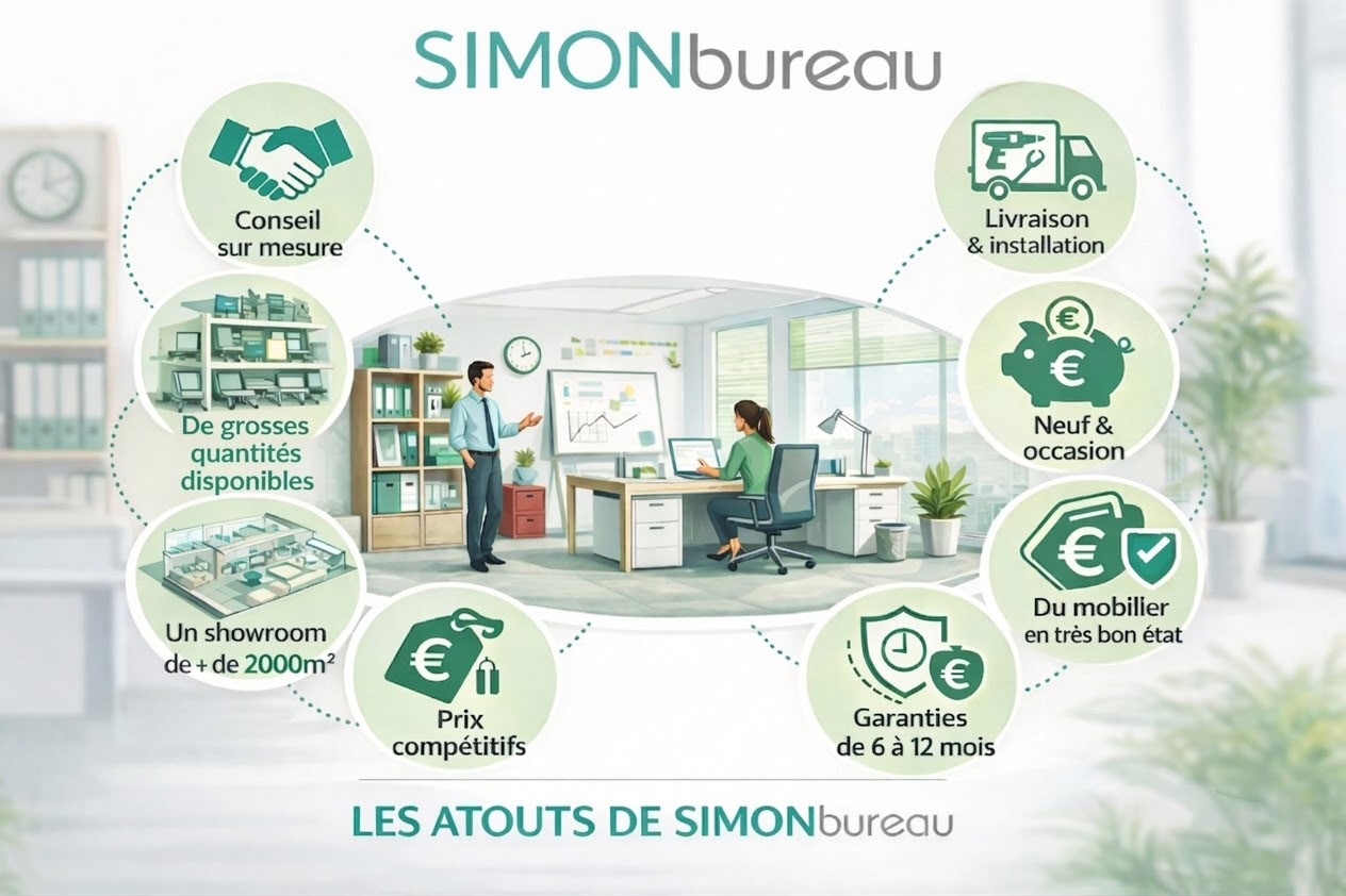 Simon Bureau est la solution idéale pour les organisations comme les entreprises, les collectivités et les administrations qui cherchent à s'équiper de mobilier en grosse quantité, en occasion haut de gamme ou neuf/fin de série tout en intégrant une logique de côut optimisé.