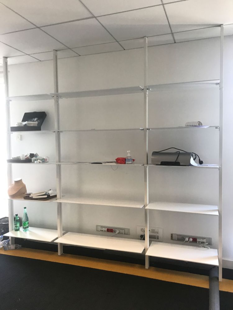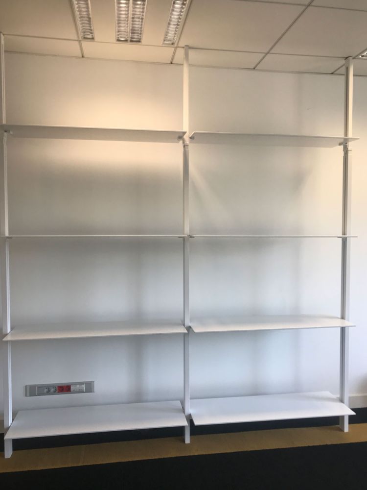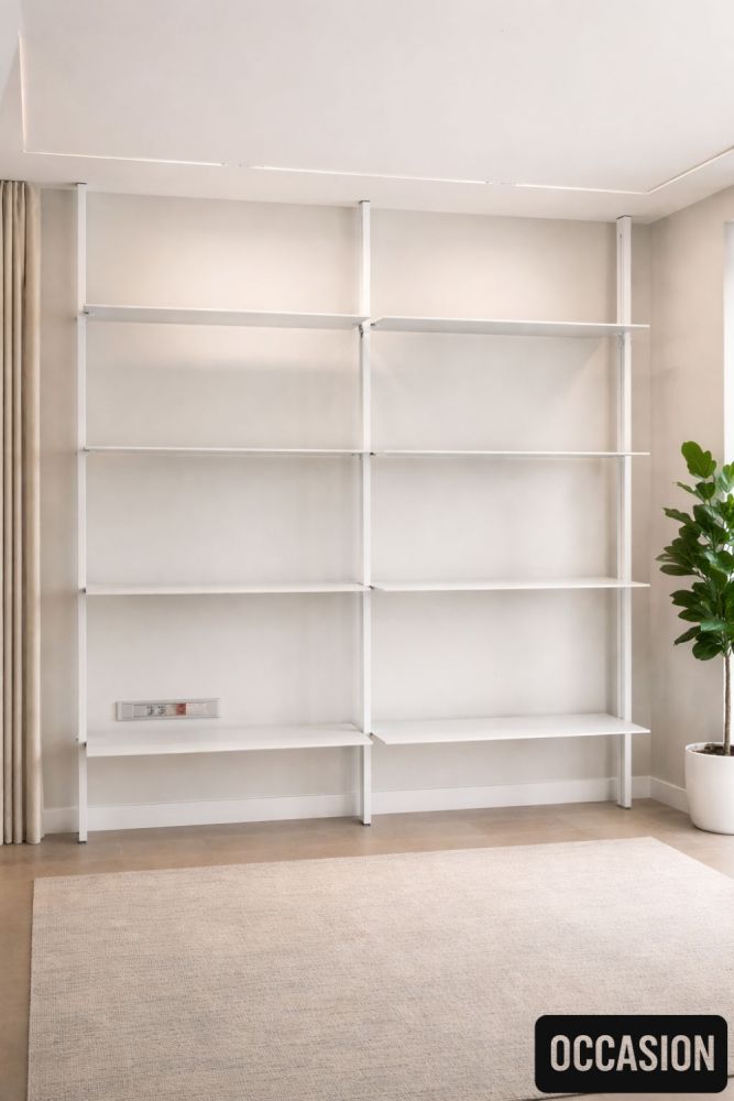 Polyvalente, cette bibliothèque System repose sur un concept ingénieux. Elle se compose de profils en aluminium blanc extensibles qui permettent de s'adapter aux différentes hauteurs sous plafond. Ces montants télescopiques se bloquent à la hauteur souhaitée et se compriment entre le sol et le plafond.