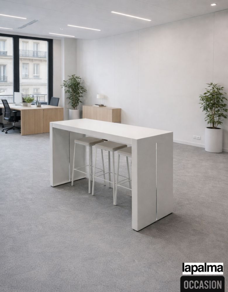 De par son architecture et son esthétisme, cette table haute de seconde main s'adapte à différents styles tels que : le design scandinave, l'intérieur minimaliste ou la salle professionnelle contemporaine.